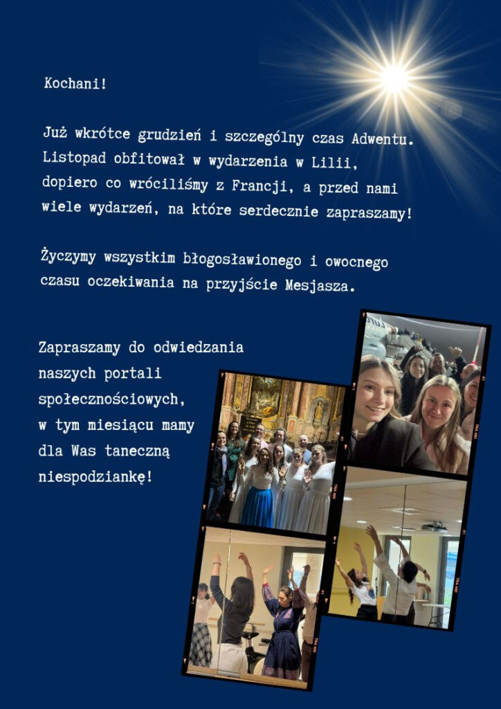 Zapraszamy do obserwowania i śledzenia naszych portali społecznościowych. W Adwencie mamy niespodziankę i zapraszamy co niedzielę na małe wyzwanie taneczne w formie prostej medytacji duchowo-ruchowej! Czas Adwentu to czas modlitwy, pokuty, nadziei i radości, by w końcu świętować przyjście naszego Pana, Jezusa Chrystusa! Nasze coniedzielne medytacje taneczne to modlitwa o pokój, przyoblekanie się w zbroje światła Bożego i czuwanie, w uważności na bliźnich i w końcu wspólna radość z tego co zrobił dla nas dobry Bóg Ojciec, dając na świat swojego jedynego Syna Jezusa Chrystusa, Pana i Mesjasza!